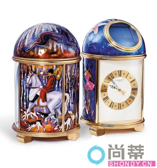 左:百达翡丽太阳能电子座钟,由卡地亚发行,1965年制造,镀铜金材质,掐丝珐琅狩猎图案。